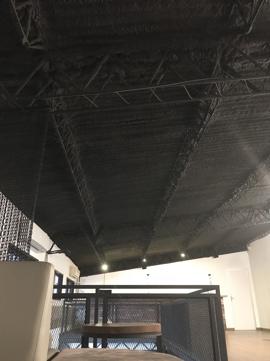Aislamiento térmico aplicado por debajo del techo con terminación de pintura negra en gastronomía